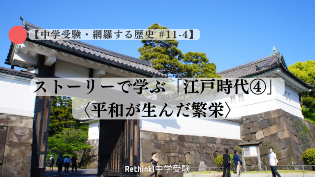 中学受験・網羅する歴史 【網羅する歴史 #11-4】ストーリーで学ぶ「江戸時代④」-平和が生んだ繁栄〈なぜ江戸時代は大きく発展し、同時に新しい歪みを抱え始めたのか〉 2026年4月16日 rethink-chuju-socialstudies 中学受験・網羅する社会 – 塾なしで最難関校を目指すための中学受験再考 前回、第3話では、2代将軍徳川秀忠から3代将軍徳川家光の時代にかけて、幕府が外との関係を厳しく管理し、いわゆる鎖国の体制を …