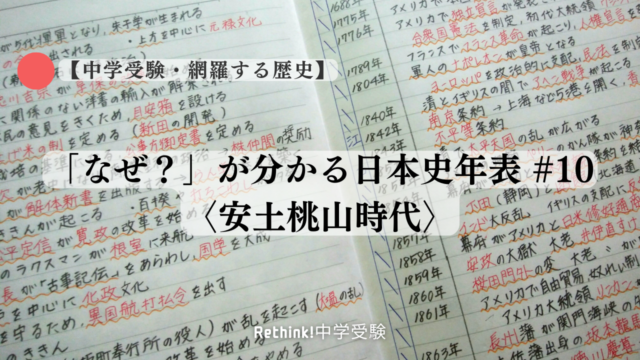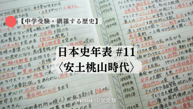 中学受験・網羅する歴史 【網羅する歴史】安土桃山時代の年表-日本史年表 #11 2026年4月19日 rethink-chuju-socialstudies 中学受験・網羅する社会 – 塾なしで最難関校を目指すための中学受験再考 安土桃山時代の年表 ① 信長編 ―― 古いしくみをこわし、天下統一への道をひらく 年できごと1568年 織田信 …